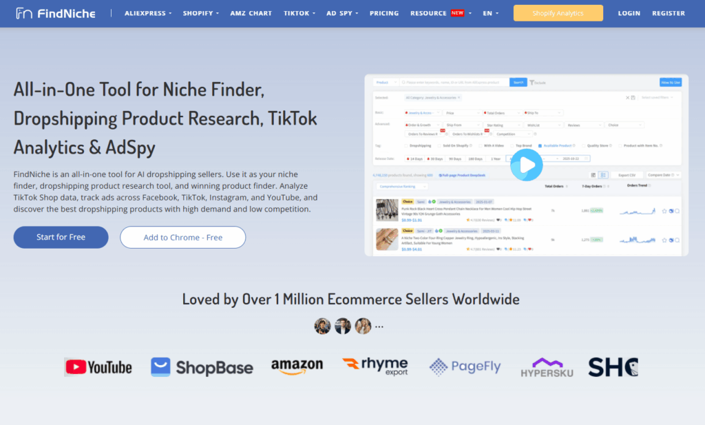 FindNiche is the only all-in-one solution for TikTok sellers, offering product research, sales tracking, competitor insights, and ad analytics in one platform.