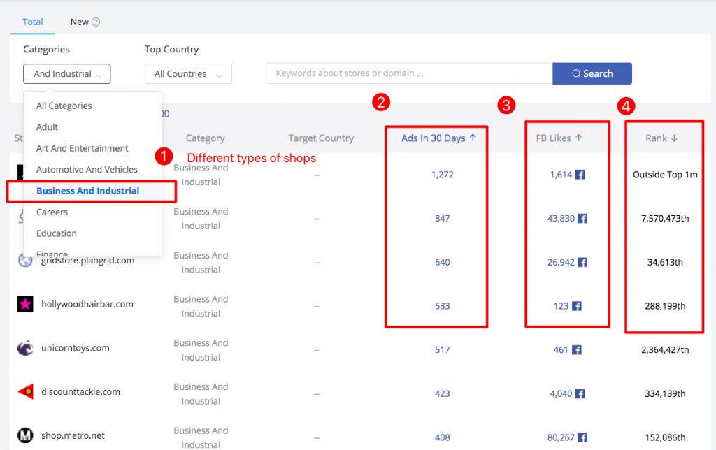 - Filter: product category, country of sale, product price, shopify product orders, release date, competition of shopify store, with FB ads.